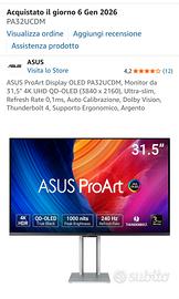 ASUS ProArt Display OLED PA32UCDM, Monitor da 31,5" 4K UHD QD-OLED (3840 x 2160), Ultra-slim, Refresh Rate 0,1ms, Auto Calibrazione, Dolby Vision, Thunderbolt 4, Supporto Ergonomico, Argento vendo per acquisto fatto di pancia... acquistato il 6 gennaio 2026 su amazon, ho comprato anche un'estensione delle garanzia di altri tre anni per guasti elettromeccanici... quindi 6 anni di garanzia in teoria... il monitor è sensazionale, ed è per professionisti veri che lavorano con il colore e per la fedeltà cromatica più fedele che possa esistere... se vedete in tutte le recensioni, caratteristiche così ce li hanno monitor il cui costo si aggira sui 14 mila euro... non vi sto mentendo, andate a vedere video su youtube. vendo per acquisto fatto di pancia, come al mio solito, me lo godo per un pò di tempo e poi svendo e ci rimetto perché sono stupido e mi ricordo di essere povero.