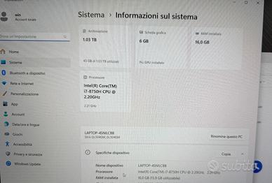 Laptop da gaming ASUS ROG Strix SCAR II in perfette condizioni. Usato pochissimo e non per giocarci: era un PC in esposizione. Nessun segno di usura su tastiera. Caratteristiche: - Modello: GL504G - CPU Intel Core i7 8a Gen modello 8750H 2.2 GHz 12 core - GPU NVIDIA GeForce GTX 1060 con 6GB GDDR5 - Display 15.6" 144Hz risposta 3ms - Doppio disco: SSHD 1 TB (disco meccanico ibrido) + SSD 128GB m.2 - RAM 16GB RAM DDR4-2667 - Scatola e alimentatore originale - connettività: 1 USB 3.1 Type C | 2 USB 3.1 Gen 1 Type A | 1 USB 3.1 Gen 2 Type A | 1 HDMI 2.0 | 1 mDP 2.0 | 1 RJ45 | 1 jack cuffie e microfono - WiFi 802.11ac 2x2 2.4/5 GHz - Bluetooth 5 - Fotocamera Stato: usato pochissimo, in perfette condizioni, non ha un graffio. Usato davvero pochissimo e non per giocarci (PC in esposizione). Tastiera pulitissima non usurata. Batteria non dura molto, in linea con un PC con qualche anno.