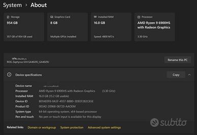 * Prezzo trattabile. Vendo per passaggio a modello superiore, un ASUS ROG Zephyrus G14 (Modello GA402RJ). È uno dei migliori laptop compatti sul mercato, perfetto sia per il gaming che per il lavoro creativo (editing video/foto) grazie al peso ridotto e allo schermo di alta qualità. - Processore: AMD Ryzen 9 6900HS (8 Core / 16 Thread). - Scheda Video: AMD Radeon RX 6700S da 8GB VRAM (Prestazioni simili a RTX 3060). - RAM: 16GB DDR5. - Schermo: 14" ROG Nebula Display, risoluzione QHD+ (2560x1600), 120Hz, 500 nits (colori spettacolari). - Sistema Operativo: Windows 11 Home originale (già resettato e pronto all'uso). - Accessori: Incluso alimentatore originale da 240W.