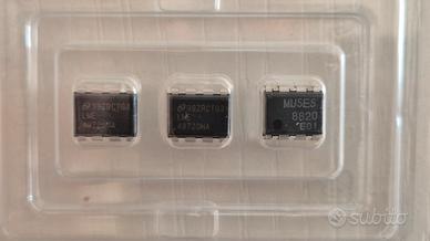 Kit di op-amp intercambiabili che comprende tre amplificatori operazionali ed uno strumento per la regolazione semplificata degli op-amp MUSE.