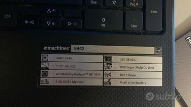 •eMachines E442: laptop 15.6″ HD con Windows 11 installato (funzionante ma non perfetto). Perfetto per chi cerca PC usato economico, per esperimenti, office leggero o upgrade SSD/RAM.