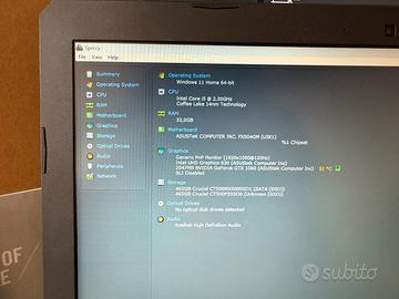 Operating System Windows 11 Home 64-bit CPU RAM Intel Core i5 @ 2.30GHz Coffee Lake 14nm Technology 32,0GB Motherboard ASUSTeK COMPUTER INC. FX504GM (U3E1) %1 Chipset Graphics Generic PnP Monitor (1920x1080@120Hz) Intel UHD Graphics 630 (ASUStek Computer Inc) 2047MB NVIDIA GeForce GTX 1060 (ASUStek Computer Inc) 51 °C SLI Disabled Storage 465GB Crucial CT500MX500SSD1 (SATA (SSD)) 465GB Crucial CT500P3SSD8 (Unknown (SSD))