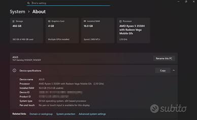Processore AMD Ryzen 5 3550H con 4 core e 8 thread, ideale per gaming leggero e produttività. Lavora a una frequenza base di 2.1 GHz e può raggiungere fino a 3.7 GHz in modalità turbo. Integra una GPU Radeon Vega 8. Specifiche: -16 GB DDR4-2400 MHz (2×8 GB, Dual Channel) -Wi-Fi RealTek 8822CE Wireless LAN 802.11ac PCI-E NIC -SSD WD Blue SN570 500 GB -NVIDIA GeForce GTX 1650 4GB GDDR5 -Tre porte USB-A e una porta HDMI, e un porto ethernet -Alimentatore originale incluso -Display 1920x1080 60Hz -La tastiera fisica del computer è in layout americano, ma è sufficiente configurare la tastiera di Windows secondo le proprie preferenze. Il computer è stato acquistato nel 2020 ed è stato utilizzato per gaming moderato e uso generale. Circa tre mesi fa è stata sostituita la pasta termica del processore. Le ventole producono un po’ di rumore e manca una vite posteriore, poiché il supporto interno è danneggiato; questo lascia leggermente aperto un lato della scocca (visibile nelle foto). Tuttavia, questo non ha mai causato alcun problema di funzionamento. Vendo esclusivamente perché ho acquistato un nuovo computer.