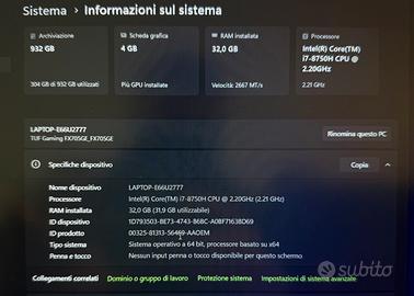 Vendo PC in ottime condizioni, le caratteristiche sono nell’ultima foto Scheda grafica 4 GB RAM 32 GB Archiviazione 1 TB Processore Intel Core i7 - 8750H 2.2 GHz Windows 11