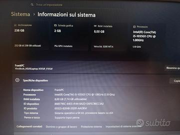 Vendo questo ASUS Vivobook usato in buone condizioni generali e perfettamente funzionante. L'ho utilizzato personalmente per anni senza alcun problema di sorta, lo cedo solo perché ho fatto un upgrade. Punti di forza - Processore Intel Core i5-1035G1 (10ª generazione): scattante e reattivo per ogni attività - 8 GB RAM LPDDR4 dual channel a 3200 MT/s: fluido nel multitasking SSD NVMe da 256 GB: accensione e caricamenti in pochi secondi - NVIDIA GeForce MX130 (2GB dedicati): puoi usare Photoshop, montare video in Full HD o giocare a titoli come Fortnite, League of Legends, CS:GO e GTA V a dettagli medio-bassi - Schermo 15.6 pollici anti-riflesso: comodo per lunghe sessioni Per cosa può andare bene? - Università, smart working, Netflix, YouTube, editing leggero, grafica base e gaming occasionale. Un computer onesto che fa tutto bene. Condizioni generali - Nessun problema a schermo, porte, WiFi, ventole o batteria - Batteria con autonomia ancora dignitosa (normale per un usato) - Caricatore originale incluso - Normali e lievi segni d'uso - Sistema operativo Windows 11 installato pulito e pronto all'uso In dotazione - Notebook ASUS Vivobook - Caricatore originale Spedizione - Imballo accurato con pluriball e spedizione tracciabile entro 1-2 giorni lavorativi. Piccole note di trasparenza Per correttezza, segnalo dei particolari estetici sulla tastiera che non ne compromettono l'uso: - I tasti "freccia su" e "fn" sono leggermente difettosi (tendono a ballare un po') ma sono tranquillamente utilizzabili. - Il tasto Ctrl sinistro era rotto e l'ho sostituito con un tasto meccanicamente identico ma di colore diverso (visibile in foto). Funziona perfettamente al 100%. ➡️ In sintesi: il computer va benissimo. La tastiera non è esteticamente originale al 100%, ma è pienamente utilizzabile. Se cerchi un buon portatile a un prezzo onesto e questi piccoli dettagli non ti danno fastidio, puoi acquistare tranquillamente.