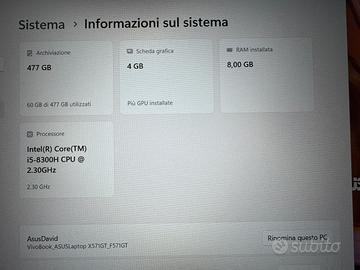 Descrizione Vendo PC Portatile Asus VivoBook (modello X571GT) in ottime condizioni estetiche, ideale per studio, editing o gaming leggero grazie alla scheda video dedicata NVIDIA. Vendo per inutilizzo in quanto sono passato a MacBook Pro. Caratteristiche Tecniche: • Processore: Intel Core i5-8300H (fino a 2.30 GHz). • RAM: 8,00 GB. (con slot fisico libero per espansione facile) • Archiviazione: SSD da 512 GB (477 GB effettivi). • Scheda Grafica: NVIDIA GeForce GTX con 4GB dedicati. • Audio: Qualità Harman/Kardon. Dettagli importanti: • Ventole e Raffreddamento: Trattandosi di un PC ad alte prestazioni, il sistema di raffreddamento è molto attivo. Le ventole sono rumorose sotto sforzo per dissipare il calore dei componenti; non è adatto a chi cerca un PC totalmente silenzioso per ambienti come la biblioteca. • Tastiera: Layout Tedesco (QWERTZ). È quasi identica alla nostra, cambia solo la posizione di "Y" e "Z" e i tasti accentati, ma è perfettamente utilizzabile impostando la lingua italiana su Windows. • Batteria: Si scarica velocemente. Il computer funziona perfettamente se utilizzato collegato alla corrente con il suo alimentatore. • Accessori: Viene fornito con il suo caricabatterie originale da 150W. Non è presente la scatola originale.