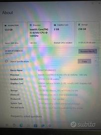 Laptop usato con Windows 10 aggiornabile a w11. 12 GB RAM/256GB SSD/Nvidia 930mx 2GB RAM. Batteria al meno 2,5h. Piccola macchia luminosa visibile solo nei schermi grigi. Non ha altri difetti.Preferisco consegna a mano cosi potete provarlo.