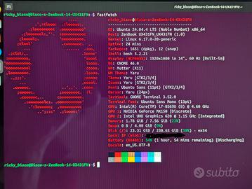 Vendo splendido Ultrabook ASUS ZenBook 14 (modello UX431FN), un concentrato di potenza e portabilità con scocca interamente in metallo. Ideale per professionisti, studenti o per chi cerca un PC leggero ma capace di gestire carichi grafici. Dettagli Tecnici: - Processore: Intel Core i7-8565U (fino a 4.60 GHz) - Grafica: NVIDIA GeForce MX150 (2GB dedicati) + Intel UHD 620 - Memoria: 8GB RAM / 256GB SSD NVMe - Display: 14" Full HD NanoEdge (cornici sottili) - Audio: 4 Altoparlanti Harman Kardon (qualità eccellente) - Sicurezza: Lettore impronte digitali Condizioni dell'oggetto: Il laptop è perfettamente funzionante. Segnalo per massima trasparenza: - Segni estetici dovuti alla rimozione di adesivi (visibili in foto). - Profilo di una porta USB leggermente rovinato, ma la porta è stata testata ed è funzionante al 100%. Software: Posso fornirlo con qualsiasi sistema operativo o formattato, a vostra scelta. Incluso alimentatore originale. Disponibile per scambio a mano o spedizione tramite TuttoSubito.