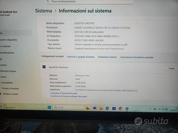 Vendo Asus Zenbook Duo UX481F, I5, 8GB RAM, 512GB, WINDOWS 11 PRO. Possibilità di installare Microsoft Office con licenza. Il notebook funziona perfettamente, presenta solo qualche lieve graffietto sulla scocca come da foto. Batteria nuova appena sostituita (posso inviare foto). Visibile per ogni prova, posso spedire. Regalo borsa per notebook nuova con etichetta.