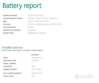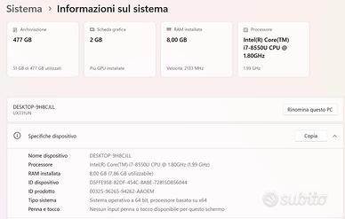 ASUS ZenBook UX331UN – bianco – NVIDIA MX150 – Intel i7-8550U @ 1.80GHz, 8GB RAM, 512GB SSD – Tastiera Italiana retroilluminata – Windows 11 – Custodia Inclusa Processore Intel Core i7-8550U @ 1.80GHz, 8GB di RAM, SSD 512GB. Display 13,3″ Full HD. Tastiera italiana retroilluminata. Windows 11 installato. NVIDIA GeForce MX150, GPU dedicata con memoria video dedicata 2 GB GDDR5, oltre alla grafica integrata Intel UHD Graphics 620. Batteria funzionante ma con capacità ridotta (circa 29,475 mWh su 50,127 mWh di design, circa 208 cicli di ricarica). Alimentatore originale incluso. Custodia sleeve per protezione/trasporto inclusa. Il portatile funziona correttamente, ideale per lavoro d’ufficio, studio, navigazione internet, streaming, produttività e grafica leggera. Ritiro a mano.