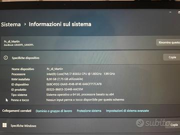Vendo ASUS ZenBook UX431F in ottime condizioni, usato con cura. Perfetto per lavoro, studio o uso quotidiano, grazie al suo design sottile, alla costruzione in alluminio e alla qualità audio Harman/Kardon.