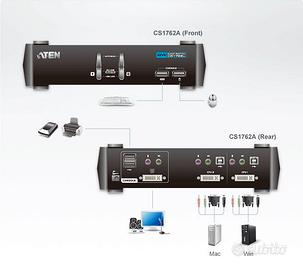 ATEN CS1762A Switch KVM, lo switch consente di accedere a due computer da una singola console con monitor e tastiera e mouse USB. Grazie all'hub USB 2.0, permette a ciascun computer di accedere a turno alle periferiche collegate. Selezione del computer tramite i pulsanti sul pannello anteriore, i tasti di scelta rapida e il mouse.