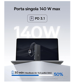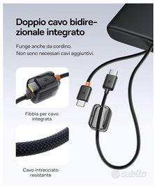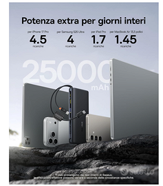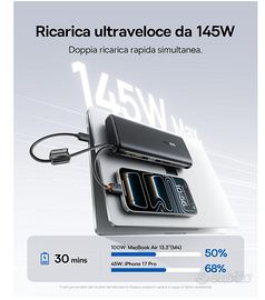 Vendo il potentissimo Powerbank Baseus FC41 da 145W, una vera "centrale elettrica" portatile ideale per chi lavora in mobilità o viaggia spesso. È uno dei pochi modelli sul mercato capace di caricare un MacBook Pro/Air alla massima velocità! 🚀 Perché sceglierlo? Potenza Mostruosa (145W): Supporta lo standard PD 3.1. Può caricare contemporaneamente un laptop a 100W e uno smartphone a 45W. Carica un iPhone al 68% in soli 30 minuti! ⏱️ Capacità Enorme (25.000 mAh): Energia infinita per i tuoi dispositivi. Carica un iPhone circa 4.5 volte o un Samsung S25 Ultra 4 volte. Cavi Integrati (Geniale!): Dispone di 2 cavi USB-C integrati super resistenti. Non dovrai mai più preoccuparti di aver dimenticato il cavo a casa. I cavi fungono anche da pratica tracolla per il trasporto. 🎒 Display LED Intelligente: Monitora in tempo reale la percentuale della batteria e lo stato di ricarica. Ricarica Multi-Dispositivo: Può caricare fino a 4 dispositivi contemporaneamente e supporta la ricarica pass-through (puoi caricare il powerbank mentre lui carica i tuoi dispositivi). Compatibilità Totale: ✅ MacBook Pro / Air e altri laptop USB-C ✅ iPad Pro / Air / Mini ✅ iPhone (tutte le serie, incluso il supporto per le ricariche più veloci) ✅ Samsung serie S24/S25, Tablet e Console (Nintendo Switch/Steam Deck) Design e Condizioni: 💎 Nuovo. Design elegante nero, bordi arrotondati e finitura premium anti-impronta. Molto compatto rispetto alla capacità offerta. 📦 Spedizione immediata con imballaggio protettivo professionale.