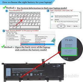 La batteria TMFYT di BLESYS è compatibile con le batterie originali 0TMFYT 8N0T7 FW8KR TMFYT V5MHM P73F P73F001 08N0T7 451-BCJQ [La batteria BLESYS TMFYT è compatibile con i seguenti laptop:] Per Dell XPS 15 serie 9575 Le batterie BLESYS hanno una garanzia di 12 mesi. Se avete domande sulle batterie (ad esempio problemi di compatibilità o qualità), Vi offriamo spiegazioni professionali ed esaustive in qualsiasi momento. [ Come mostrato nella Figura 4 ] È possibile utilizzare uno di questi metodi per verificare se la batteria BLESYS TMFYT è adatta al notebook. Capacità: 75 Wh Voltaggio: 11,4 V