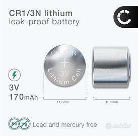 Super occasione, set di cinque batterie nuove a bottone, sigillate nella loro confezione tipo CR1/3N compatibili con diversi dispositivi fra cui: fotocamere, apparecchi acustici, radiocollari e collari da addestramento cani, mirini laser, telecomandi auto. Vendo scontatissime, un vero affare (prezzo originale 16,89).
