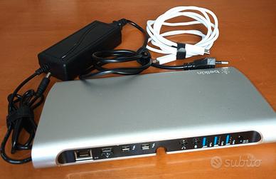 Belkin Thunderbolt Express Dock Station F4U055 per Mac. 1 porta Firewire 800, 1 porta Thunderbolt 2.0, 3 porte USB 3.0, 1 porta Ethernet, 1 presa cuffia, 1 ingresso microfono. Completo di Alimentatore e Cavo Thunderbolt Maschio/Maschio da connettere al Mac. Solo il cavo vale 70 euro circa.