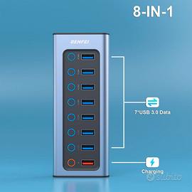 BENFEI HUB USB 3.0 Alimentato 8in1, 7 Porte USB 3.0 e 1 Porte Carica Rapida con Interruttore LED on/off e Adattatore di alimentazione 18W, Compatibile PC MacBook Windows Mac OS Linux (8in1)