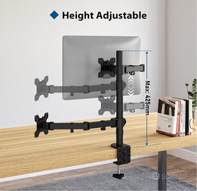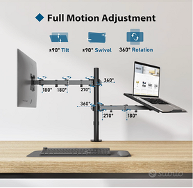 Doppio supporto per Monitor Universale. - Supporto per monitor singolo, che può installare Monitor LCD a LED da 13 a 27 pollici, massimo 10 kg, dimensioni VESA 75x75 mm e 100x100 mm. - Il vassoio per laptop è lungo 355 mm e largo 300 mm, il che lo rende il più adatto per un laptop da 17 pollici con una capacità di 10 kg. Gli utenti possono rimuovere il vassoio del laptop per installare monitor aggiuntivi. Le braccia sono lunghe 410mm. - Movimento completo regolabile: una colonna robusta e regolabile in altezza. La distanza da VESA-Plate al desktop può essere regolata da 0 a 43,4 cm. Posizionare i due monitor ad altezze diverse. Ogni braccio ha 2 snodi che possono essere ruotati di 180°. La piastra VESA può essere ruotata di 360° e ruotata di 360° e inclinata da + 90° a - 90° per una flessibilità massima. - Design ergonomico: con un monitor e un laptop, potresti facilmente liberare spazio negli uffici e aumentare la tua produttività. La scheda VESA è rimovibile per una facile installazione. Questo design ti consente di scegliere la posizione corretta e ridurre la tensione al collo e agli occhi. - Facile da Installare. L'installazione può essere completata entro 10 minuti. 2 Metodo di installazione: 1) Clip da tavolo: la clip a "C" per impieghi gravosi offre la massima stabilità, rendendo lo schermo fissato saldamente e in sicurezza; 2) Installazione della base della fibbia. **Molteplici caratteristiche** - Gestione integrata dei cavi, per mantenere la scrivania pulita e ordinata; - Alloggiamento per le chiavi a brugola; - Fori di ventilazione per mantenere il laptop fresco; - Rondelle di rame antiruggine per l'uso a vita.