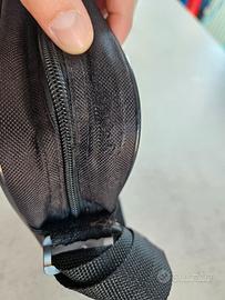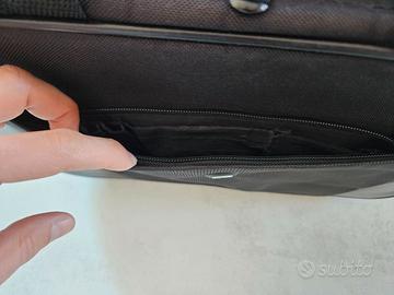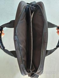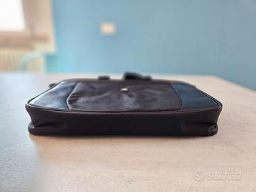 Pratica borsa porta PC a tracolla, originale marca HP, in robusto tessuto tecnico nero. La borsa ha un design pulito e professionale, con il logo HP sul davanti. Caratteristiche principali: Capacità: Progettata per contenere la maggior parte dei laptop (almeno fino a 15,6 pollici). Organizzazione: Dispone di uno scomparto principale imbottito con un divisore interno per separare il laptop da documenti o altri oggetti. È presente anche una tasca frontale esterna con zip per oggetti di rapido accesso. Trasporto Comodo: Include una tracolla regolabile e rimovibile con un cuscinetto imbottito per la spalla, oltre alle classiche maniglie superiori. Dettagli di Qualità: Le cerniere sono robuste e le cuciture ben fatte. L'esterno presenta dettagli in similpelle che aggiungono un tocco elegante. Stato: Ottimo. Il tessuto è pulito e senza macchie. Le cerniere e la tracolla funzionano perfettamente. Sui 2 angoli superiori c'è una leggera formazione di pilling (pallini), come mostrato nelle ultime 2 foto.