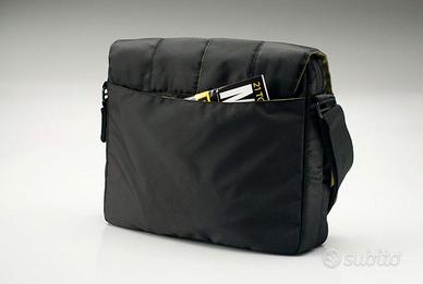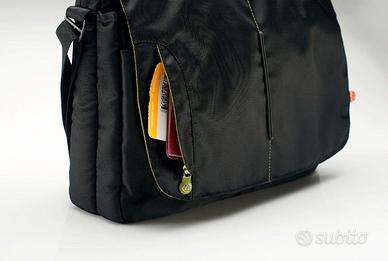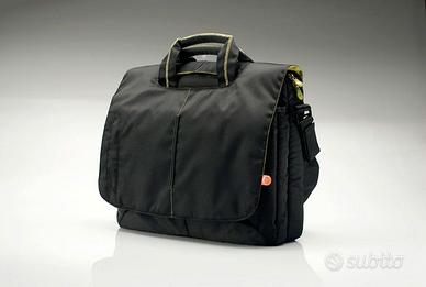 Vendo borsa per computer fino a 19", nuova, perfetta. Ne uso da anni una identica e sono ultra soddisfatto, ottime cerniere e cuciture. Può contenere un portatile Mac o Pc fino 19"(39,5x27x3,5); misura esternamente 41x33x10 cm e pesa 9 etti. Nera, in tessuto tecnico idrorepellente, con cuciture verdi sulle 2 tasche davanti (internamente verdi) e sui manici (flosci sui lati, con un'anima di gomma nell'impugnatura); l'alloggiamento del portatile ha un'imbottitura in neoprene dello spessore di 1 cm (davanti, dietro, sopra, sotto ed ai lati ed il portatile è completamente protetto dagli urti), è foderata in vellutino nero; si chiude con 2 zip YKK; la borsa ha una copertura che ricopre le tasche esterne con chiusura in velcro ai lati per evitare furti o smarrimenti: 4 tasche davanti (2 + 2, con dentro altre più piccole pensate per schede di memoria, batterie, etc.) e 1 tascone grande, largo quanto la borsa; sul retro c'è un tascone largo quanto la borsa anch'esso. La tracolla è regolabile e a scomparsa, con pad per la spalla imbottito scorrevole, manici a scomparsa. Ha un rilievo verticale in gomma al centro della copertura, la "testa" delle cerniere YKK sovradimensionata con logo in rilievo su ambo le parti, placca interna in alluminio con numero di serie. E' compreso un piccolo portachiavi ad innesto (il cerchietto cromato che vedete nella foto 3, a destra sulla tasca).