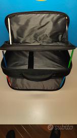 1 Scomparto centrale imbottito da entrambi i lati con perimetro rigido anti urto e cadute accidentali + vani a retina elasticizzata per accessori, mouse e cavetti.