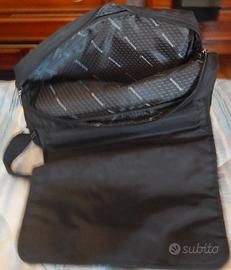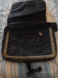 Cedo questa borsa per notebook perfetta come nuova tutta foderata internamente, cosi composta:1 grande cerniera davanti e una piccola x tasca interna, cerniera per notebook, sotto altra cerniera per accessori notebook, 1 tasca grande e una piccola , colore, grigio e nero con relativa maniglia per il trasporto sia a mano che a spalla.