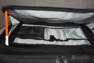Borsa per computer portatili fino a 18,4", colore nero, marchio Gaudì. Scomparto porta PC imbottito e con divisorio spostabile (con velcro); scomparto posteriore porta-documenti con divisorio, scomparto esterno sul retro e tasca frontale suddivisa per riporre piccoli oggetti (cavetti, mouse, penne, blocco per appunti, eccetera); fornita di tracolla. Sul retro è presente una maniglia per infilare la borsa sul manico dei trolley. Qualche macchia nello scomparto porta PC (visibili nelle foto), ma per il resto in ottime condizioni di conservazione. Misure interne (scomparto porta PC) 46,5 x 33,5 cm, altezza 6 cm abbondanti. Il computer presente nella foto è un Acer da 15,6" e serve solo per dare un'idea delle dimensioni della borsa.