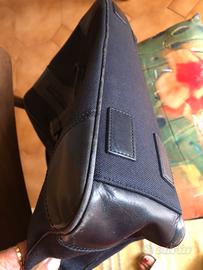 In tessuto blu, con inserti in pelle blu e bordeaux