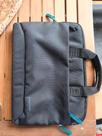 Borsa super slim e minimal, in materiale tecnico con dettagli in contrasto colore (nero e verde petrolio) per notebook fino a 15.6”. Vano interno unico con orecchie in neoprene per bloccare il pc. Il lato anteriore è dotato di una tasca esterna.
