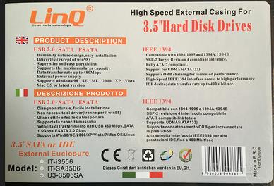 Box esterno HDD SATA da 3,5" U3-3506SA LinQ HardDisk Serial ATA con cavo USB 3.0 e alimentatore.