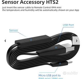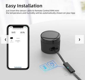 【Nuove funzionalità】Il RM4 Mini è alimentato tramite cavo USB (incluso nella confezione). Supporta un cavo sensore esterno di temperatura e umidità (venduto separatamente). Quando il sensore è collegato, l'app BroadLink mostra la temperatura e l'umidità dell'ambiente. Include anche la configurazione automatica con FastCon: aggiungi il primo dispositivo FastCon all'app normalmente e i nuovi dispositivi alimentati verranno rilevati automaticamente e mostrati nell'app.