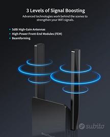 3000Mbps WiFi 6 Velocità: Questo ripetitore WiFi 6 a 4 flussi offre una velocità incredibile di 2402Mbps sulla banda 5GHz e 574Mbps sulla banda 2,4GHz. Permette di giocare in modo reattivo, di effettuare uno streaming 4K/8K impeccabile e di effettuare videoconferenze senza interruzioni.