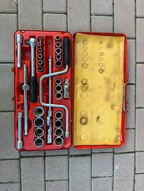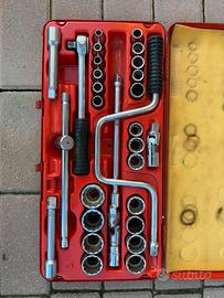 Contenuto: Include un cricchetto da 1/2 pollice, varie bussole esagonali e prolunghe. Custodia: Gli utensili sono organizzati in una robusta valigetta metallica rossa. Utilizzo: Ideale per lavori di meccanica generale che richiedono serraggi robusti.