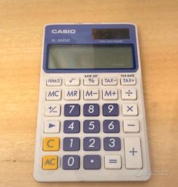 Calcolatrice Casio SL-300VC, modello compatto e leggero con alimentazione solare + batteria (Two Way Power). Perfetta per scuola, università o ufficio. Display ampio e tasti grandi per un uso comodo e preciso. Dimensioni: circa 11,8 x 7×1 cm Alimentazione: solare + batteria Colore: bianco e viola Funzioni: percentuale, radice quadrata, memoria, imposta IVA (TAX), calcolo ore/minuti/ secondi Condizioni: ottime condizioni, usata pochissimo Spedizione tracciata e imballaggio accurato.