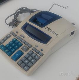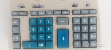 “Calcolatrice usata ma perfettamente funzionante. Piccoli segni di usura e nastro da sostituire. Sportello azzurro dove si inserisce la carta con gancetto rotto , si incastra solo da un lato.”
