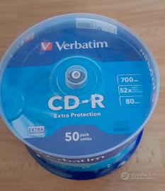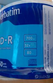 Campana da 50 CD-R marca Verbatim, linea "Extra Protection". Prodotto è nuovo e ancora sigillato nella sua confezione originale di plastica. Ideali pet backup dati, masterizzazione musica o archiviazione file. Caratteristiche tecniche: capacità 700 MB, durata 80 minuti, velocità di masterizzazione fino a 52x, quantità 50 dischi.
