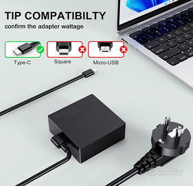 NUOVO – MAI UTILIZZATO E NELLA SUA CONFEZIONE ORIGINALE Caricabatterie USB C da 100W Uscita: 20V 5A 100W (Compatibile con 90-100W 65W 45W 27W 15W); Ingresso: 100-240V ~ 50/60Hz. Dimensione della spina: TYPE-C/ USB-C. Permette l'utilizzo in diversi paesi e regioni. Leggero e compatto, facile da trasportare – compagno ideale per i viaggi d'affari e il tragitto quotidiano verso il lavoro. Si prega di verificare i parametri di potenza e gli adattatori originali prima dell'acquisto per assicurarsi che corrispondano. Il caricabatterie USB C Tuvoyo da 100W è realizzato in materiale TPE di alta qualità ed è stato testato con più di 25.000 piegature, molto resistente e robusto, ed è la lunghezza perfetta per la tua vita quotidiana e con diverse funzioni intelligenti, tra cui protezione da cortocircuito, protezione da sovratensione, protezione da sovracorrente e protezione interna dal surriscaldamento. Soddisfa gli standard industriali più elevati, sicurezza, ricarica veloce ed efficiente. Vendo, nelle condizioni di NUOVO, a 19€.