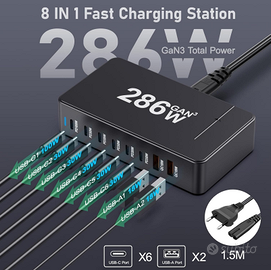 Caricatore USB multipresa Supporto PD (power delivery) e QC (quickcharge) Possibilità di ricaricare anche pc portatili compatibili con PD, macbook ecc ✅Prodotto completamente nuovo e mai utilizzato✅ 286W scritta sul prodotto non è la potenza effettiva ma la somma degli output massimi raggiungibili da ogni singola presa. 1 USB Type-C con supporto PD 100W 5 USB Type-C con supporto PD 30W 2 USB Type A con supporto QC 18W