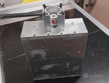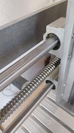 Carrello asse Z per CNC lavorazione legno. Da me progettato e fatto realizzare con CNC industriale per la max, precisione. Il movimento verticale è azionato da vite a ricircolo di sfere 1605 ed il carrello scorre su due guide temprate d. 16. La piastra di fondo è forata per ospitare 4 cuscinetti lineari SCS16UU (guida) e supporto per chiocciola 1605 (movimento) lungo l'asse Y. La parte superiore è forata per calettare motore Nema 23. La parte frontale è predisposta per bloccare anello standard d. 43 per inserimento fresatrice con questo tipo collare. Le parti realizzate a CNC sono in alluminio e vite e guide in acciaio temprato di precisione.