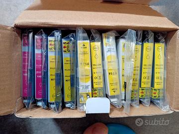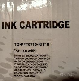 cartucce d'inchiostro compatibili per stampanti Epson modelli Stylus Color D78 / D92 / DX7000F / DX5000 / DX4050 /DX4000 / DX4400 / DX4450 / DX5050 / DX6000 /DX6050 / DX7400 / DX7450 / DX8400 / DX8450 / DX9400 / DX9400F / SX100 / SX110 / SX200 / SX209 / SX210 / SX400 / SX510W : 13 pezzi nero T0711 ( T711 ) 6 pezzi ciano T0712 ( T712 ) 6 pezzi magenta T0713 ( T713 ) 9 pezzi giallo T0714 ( T714 ). Ancora sigillate. Vendo per passaggio ad altra stampante. Prezzo 1 euro cadauna.