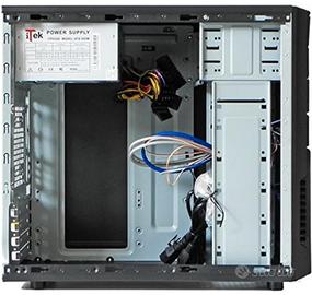 Itek Eagle è la soluzione ideale per assemblare desktop dalle dimensioni contenute ma senza trascurare gli aspetti tecnici, funzionali e qualitativi che hanno sempre contraddistinto i prodotti itek. Questo mini tower ha sul frontale una porta usb3.0 e, all'interno, un alimentatore da 500w silenzioso. Formato: micro atx slot 5 ¼: 2 esterni. Slot 3 ½: 1 esterno + 5 interni usb: 1xusb2.0 e 1xusb3.0 + hd audio air duct laterale da 8cm colore back psu 500w con ventola da 12cm silenziosa connettori alimentazione, mb 20/24, 2xsata lunghezza: 40cm, 43,5cm (con frontalino). Altezza: 38cm, 39cm (con frontalino) larghezza: 18cm.