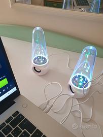 Bellissime casse con luci led e giochi d'acqua che vanno in sincronia con la musica. Perfettamente funzionanti, hanno presa Usb e jack, senza segni di utilizzo, buon audio. Non hanno bluetooth.