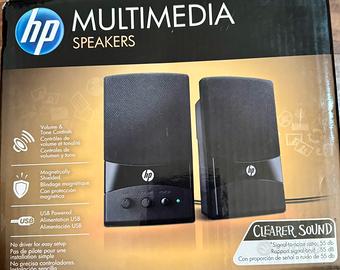 Set di casse audio multimediali HP per PC. Design compatto ed elegante, ideali per migliorare l'esperienza sonora del tuo computer. - Alimentazione tramite USB. - Controlli sul pannello frontale per tono, volume e accensione. - Suono chiaro e definito. Condizioni: PERFETTAMENTE FUNZIONANTI #hp