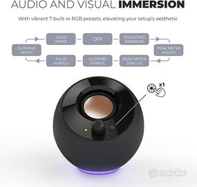 Le Casse stereo Creative Pebble SE si basano sul modello originale Creative Pebble, che ha ottenuto il riconoscimento come "Migliori altoparlanti per PC" ma con l’aggiunta di 7 preimpostazioni integrate di illuminazione RGB (per essere precisi le combinazioni possibili sono: Arcobaleno pulsante > Misuratore di picco (multicolore) > Misuratore di picco (colore singolo) > Viola brillante > Viola fisso > Bianco brillante > Bianco fisso > Spento (vedi immagine)