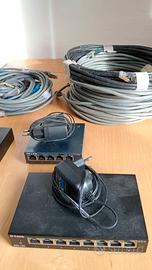 cavi ethernet, circa 50-60 metri , suddivisi in circa 10 pezzi di diverse misure (20-5-2mt), quasi tutti marca Hama. I cavi dovrebbero essere di categoria 6, molto veloci, resistenti e affidabili. Gli switch sono 2 d-link des 105 a 5 entrate 1 tp-link tl-sg105 a 5 entrate e 1 d-link dgs-108 a 8 entrate con i relativi alimentatori. Il materiale può essere utilizzato per creare una rete interna tra Mac, Pc, Nas di laboratorio, ufficio, ecc. Valore approssimativo materiale nuovo 300 euro. Non vendo separatamente. Non spedisco. Possibilità di scambio a mano Toscana centrale (fi-po-pt).