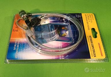 Cavo d’acciaio di sicurezza rivestito, lunghezza cm.150 per Notebook, nuovo mai utilizzato, ancora in blister sigillato con attacco universale per PC con due chiavi numerate.