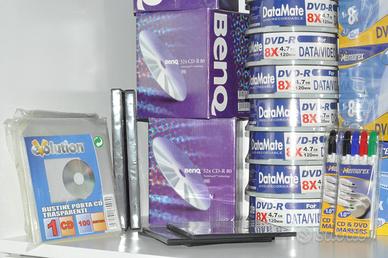 - SCONTI PER ACQUISTI IN LOTTO - - POSSIBILE VENDITA INTERO LOTTO - - Confezione sigillata da 100 CD-R BENQ 52x vergini pila campana spindle 700 Mb, 80 min = 9 euro/pz + 100 bustine Evolution in regalo free - Confezione sigillata da 50 CD-R SIX 52x vergini pila campana spindle 700 Mb, 80 min = 5 euro/pz / 9 euro coppia - Confezione sigillata da 10 CD-RW SIX 52x vergini pila campana spindle 12x = 9 euro/pz - Confezione sigillata da 25 DVD-R Data Mate 8x vergini pila campana spindle 4,7 Gb, 120 min = 9 euro/pz - Confezione sigillata da 10 DVD-R Memorex 1x-8x vergini pila campana spindle 4,7 Gb, 120 min = 5 euro/pz - Confezione sigillata da 10 DVD-R Memorex 1x-8x vergini Pack con custodie 4,7 Gb, 120 min = 8 euro/pz - Confezione sigillata da 10 DVD-RW SIX 1x-8x vergini pila campana spindle 4x = 10 euro/pz - Confezione sigillata da 10 DVD-RW Intenso 1x-4x vergini pila campana spindle 4,70 Gb, 240 min = 10 euro/pz - Custodia Raccoglitore Evolution in Stoffa Blu/Mappamondo da 28 CD/DVD (14 fogli) = 5 euro - Custodia Raccoglitore Evolution in Stoffa Nero-Rosso da 28 CD/DVD (14 fogli) = 5 euro - Custodia Raccoglitore Evolution in Stoffa Nero-Verde da 28 CD/DVD (14 fogli) = 5 euro - Custodie rigide nere in plastica per CD e DVD singoli (box quadrati e rettangolari) = 0,30 cent/pz - Confezione sigillata da 10 Custodie Evolution Rigide Gusci Colorati per CD/DVD singoli = 3 euro/pz - Confezione sigillata da 4 Pennarelli Marker Memorex per CD/DVD = 3 euro - Confezione sigillata Bustine trasparenti Evolution da 100 = 1,50 euro/pz (gratis acquistando 100 CD/DVD)