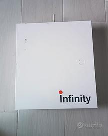 INFINITY, centrale di allarme con 8 zone programmabili come 8 aree diverse una dall'altra. Tastiera LCD per la gestione della centrale.(Inserimento disinserimento e parzializzazione, esclusione zone e cambio numeri telefonici) Modulo GSM per la gestione della centrale da remoto e per ricevere SMS è chiamate telefoniche durante un allarme. Per ricevere SMS tecnici (mancanza rete batteria bassa etc. etc.