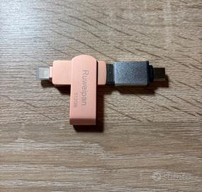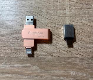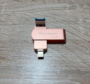 Chiavetta USB 4-in-1da512 GB Dispone di porte Lightning (per iPhone/iPad), USB-A 3.0 (per PC), Micro-USB e USB-C tramite adattatore. Funziona con sistemi operativi Windows, iOS, Mac OS, Linux e Android. Permette il trasferimento dati e l'archiviazione di documenti, musica, video e immagini.