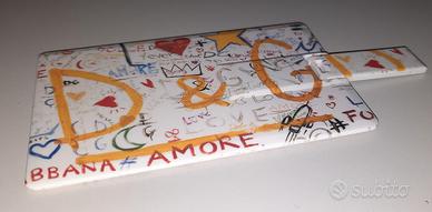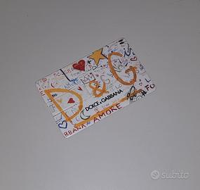 Chiavetta USB 2 GB a forma di carta di credito con design originale Dolce & Gabbana. Decorazione colorata con scritte e disegni in stile graffiti/street art. Logo D&G ben visibile al centro. Porta USB richiudibile a scomparsa per una maggiore praticità e protezione.